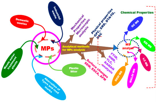 MS is one of the rapid and reliable analytical tools that provides enhanced accuracy when it comes to the characterization of MPs, revealing their polymer composition, additives, and their associated organic toxic substances. Among all the MS techniques, gas chromatographic mass spectrometric (GC-MS) analysis of MPs was found to dominate. Peters et al. [16] detected the MPs extracted from the stomach of 1381 marine fish from the coast of Texas Gulf, using pyrolysis GC-MS (pyr-GC/MS) with Electron impact (EI+ 268, 70 eV) ionization as the analytical sensor.