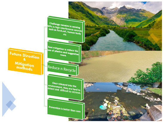 In terms of mitigation methods for avoiding microplastics in the environment, the ideal method is that prevention is better than cure. Why would we release microplastics into the environment and then gather or detect them using sophisticated methods? The reduced use of plastics is unequivocally the ideal solution. Once released into the environment, MPs are hard to detect—the wise and smart handling of plastics is the only solution. We have become too intertwined with plastics; we need to find a way to minimize their use. Banning plastics seems near impossible, however, recycling them could be the ideal best-case scenario (Figure 5).
