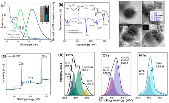 (a) Absorbance, photoluminescence (PL) emission, and photoluminescence excitation (PLE) spectra of the synthesized CDs (inset: photographic image of the CDs suspended in water, under daylight (A) and UV light (B)), (b) FTIR spectra of raw and carbonized leaves, (c–f) TEM micrographs (inset in (d) reveal the magnified view of interplanar distance and the particle size distribution), (g) XPS survey, and (h) high-resolution XPS spectra corresponding to C1s, O1s, and N1s of CDs.