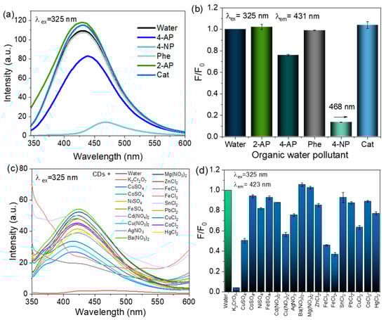 To assess the selectivity of CDs, the changes in the fluorescence intensity in the presence of different organic pollutants were measured. The fluorescence response of CDs for 4 NP was more sensitive than that of other organic phenolic compounds. A complete PL quenching (turn-off) was observed in the presence of 4 NP (Figure 2a,b). While assessing the selectivity towards different metals, it is important to consider that the most common ions found in rivers and lakes around the world are Al, As, Cd, Co, Cr, Cu, Fe, Hg, Mn, Ni, Pb, and Zn [37]. The majority of these ions along with others such as Ba, Hg, and Mg were tested to observe the analytical performance of the proposed nanoprobes towards the heavy metals present in the water.