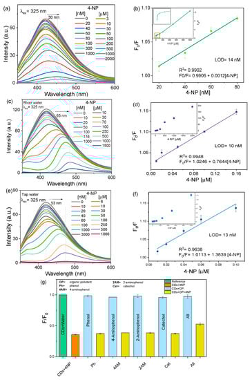 Figure 3b represents the Stern–Volmer equation (F0/F = 0.9906 + 0.0012 [4-NP]) with an R2 of 0.9902 and an estimated LOD of 14 nM in the linear range of 20 to 80 nM. The Stern–Volmer relation is defined by F0/F = 1 + KSV [Q], where KSV is the slope and Q is the analyte concentration. The LOD is estimated according to 3σ/S, where σ is the standard deviation of the response of the the carbon solution signal without the analyte and S is the slope of the calibration plot in a good linear fitting range [38,39]. The results of the evaluation of 4-NP sensitivity in river water from 10 to 1.5 mM with a bathochromic shift of 65 nm and fitted data in linear adjustment from 10 to 160 nM are shown in Figure 3c and its corresponding figure (Figure 3d) uses a Stern–Volmer equation (F0/F = 1.026 + 0.7644 [4-NP], R2 = 0.9948) with an estimated LOD of 10 nM. The evaluation of 4-NP in tap water is depicted in Figure 3e with an LCR of 10 nm–1 mM and a Stern Volmer equation of F0/F = 1.0113 + 1.3639 [4-NP], R2 = 0.9638 and a red shift of 53 nm (Figure 3f). The LOD was observed as 13 nM in the concentration linear range between 10 to 100 nM. A comparison of F0/F vs. different concentrations of 4-NP in deionized, river, and tap water is included in Figure S4a.