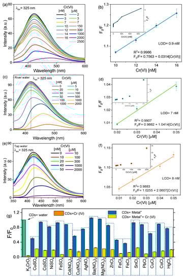 As shown in Figure 4a, sensitivity experiments using nanoprobes that were also selective for Cr(VI) were performed in the range 3 nM to 2.5 mM; the maximum emission peak was maintained at 420 nm with low-concentration solutions, i.e., from 3 nM to 7 , however, the PL band is then slightly redshifted. Figure 4b shows the corresponding Stern–Volmer equation (F0/F = 0.7563 + 0.0314 [4-NP]) with the R2 of 0.9986 and an estimated LOD of 0.9 nM. The Cr(VI) in river water was tested in the range of 20 nM to 2 mM (Figure 4c). The obtained Stern–Volmer equation was F0/F = 0.9882 + 1.0414 [Cr(VI)] with the R2 of 0.9907 and an estimated LOD of 7 nM is depicted in Figure 4d. In the case of detection for Cr(VI) in tap water (Figure 4e), there is a low concentration range (from 10 to 10 ) in which the maximum PL peak is steady around 423 nm, while in higher concentrations (100 to 2 mM), a displacement of the signal is observed (around 50 nm). The Stern–Volmer equation for tap water is F0/F = 1.0255 + 2.0607[Cr(VI)] with an R2 of 0.9883 and LOD of 8 nM (Figure 4f). A comparison of F0/F vs. different concentrations of Cr(VI) in deionized, river, and tap water is included in Figure S4b indicating a high proximity in the large range of 3 to 1000 .