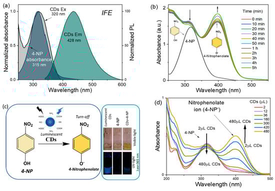 The noticeable change in color is accompanied by a minor decrease in the band intensity corresponding to 4 -nitrophenol (band at 320nm (in absorbance); Figure 5d not only gives an additional confirmation of the change of 4-NP concentration but also opens up a possibility for their usage as dual-sensors (absorbance and PL). The luminescence quenching and the formation of the 4-nitrophenolate ion is possibly induced by the functional groups around the CDs’ surface. The pH for the CDs’ stock solution was approximately ~7 whereas the pH value for 4-NP was obtained around 5. The pH rises to almost 6.9 when CDs interact with the phenolic solution to generate the deprotonation of 4-NP to 4-nitrophenolate ion. The pH increment has been reported in other deprotonation stages from 4-NP to 4-NP ion, when sodium borohydride has been used as a reducing agent [60].