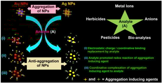Schematic of the anti-aggregation strategy applied in Au NPs/Ag NPs-based colorimetric sensors toward metal ions, anions, bio-analytes, pesticides, and herbicides.