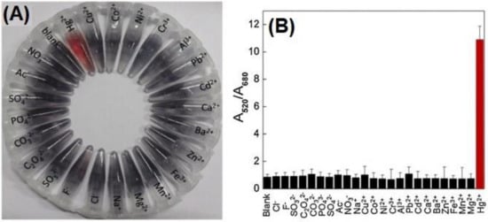 Selectivity of the Au NPs-based detection system (containing 3.1 µM of OPD) for Hg2+ compared with other ions. (A) Photograph of the detection systems incubated with Hg2+ (2.0 µM) or other ions (20 µM); (B) A520/A680 (ratio of the absorbance value at 520 nm to that at 680 nm in the UV–vis spectra) of the detection systems incubated with Hg2+ (2.0 µM) or other ions (20 µM) (mean ± SD, n = 3) ((A,B) are reproduced with the permission from [50]).
