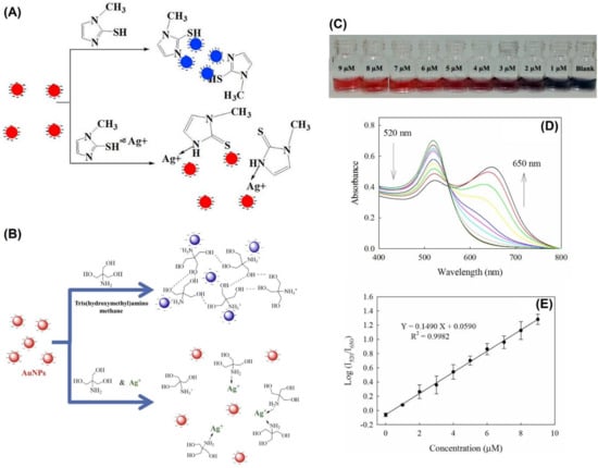(A) Schematic representation of the analytical process for Ag+ detection (reproduced with the permission from [58]); (B) schematic representation of the Au NPs-based colorimetric assay for silver; (C) color changes with increasing concentration of Ag+ from 0 to 9 µM; (D) SPR absorption change of Au NPs in tris solution with Ag+ concentration varied from 0 to 9 µM; (E) the linear response of the system to Ag+ ion concentration. (The concentration of tris solution was 9 mM, and the pH was fixed at 7.5. Au NPs’ concentration was 1.2 nM.) ((B–E) are reproduced with the permission from [60]).