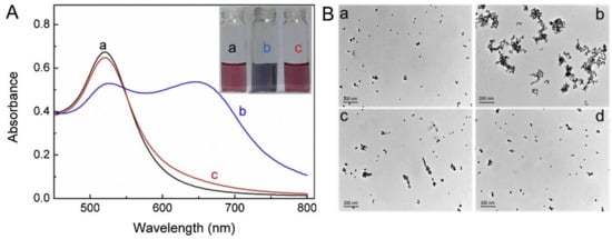 (A) UV−vis spectra and colors of Au NPs in the absence (a) and presence of 0.5 µM CTAB (b), after the addition of 0.5 µM CTAB and 1.5 µM SCN− (c). (B) TEM images of Au NPs, naked Au NPs (a), and Au NPs with 0.5 µM CTAB: in the presence of 0 (b), 1.5 µM (c), and 2.0 µM SCN− (d); scale bars for (a–d) = 200 nm ((A,B) are reproduced with the permission from [71]).