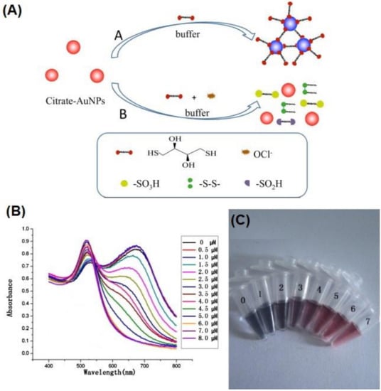 (A) Schematic representation of the hypochlorite sensor with unmodified gold nanoparticles; (B) optical absorption spectra in the presence of different concentrations of hypochlorite. Conditions: PBS (10 mM, pH 7.17), DTT (4.0 µM), and (C) photographs showing the colorimetric responses (the hypochlorite concentrations, in µM, are listed on the centrifuge tubes) ((A–C) are reproduced with the permission from [73]).