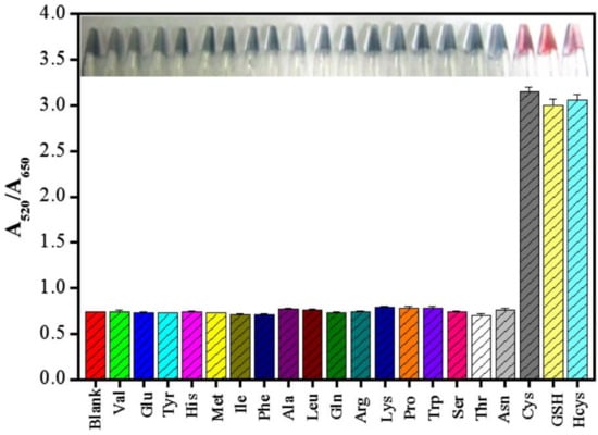 Li et al. adopted the “S-adenosyl-L-methionine” (SAM; 0.8 µM) as an aggregation-inducing agent with CI-Au NPs (particle size = 10–20 nm; conc. = 3.5 nM) toward the quantification of biothiols (GSH, Cys and HCys) [77]. Firstly, adding SAM neutralized the potential of dispersed Au NPs and resulted in the aggregation with a color change from red to blue. Pre-treating biothiols with SAM disturbed the aggregation by displacing SAM from the NPs’ surface via strong Au-S binding, thereby changing the color from blue to red. The optimum pH and incubation time were fixed as pH 7 (buffer: 10 mM borate buffered saline (BBS) made up from sodium borate and NaCl) and 5 min. TEM and SPR investigations attested to the anti-aggregation induced by biothiols. The linear regressions of GSH, Cys, and HCys were between 0.2 and 0.9 µM (at A520/A650), 0.4 and 1.2 µM (at A520/A650), and 0.6 and 3.0 µM (at A520/A650), with LODs of 35.8 nM, 21.7 nM, and 62.4 nM, correspondingly. This tactic shows high selectivity over a wide range of interferences, as seen in Figure 12, with recoveries in biological fluids of 96.5% to 104.4%; hence, it can be employed for real-time biothiols assay.