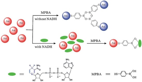 Liu et al. demonstrated the boronic acid–diol binding for a selective colorimetric assay of dihydro-nicotinamide adenine dinucleotide (NADH) [85] in which the CI-Au NPs (particle size = 13 nm; conc. = 3 nM) aggregated in the presence of MPBA (10 µM) via a strong Au-S binding to produce a color change from red to blue. By adding NADH, the cis-2,3-ribose diol containing sugar units in NADH reacts with boronic acid and induces anti-aggregation with a corresponding color change from blue to red, as seen in Figure 15. To optimize the above pH dependent reaction, a pH value of 10.5 (buffer: 18 mM NaOH from 0.2 M stock) was chosen at a fixed incubation time of 12 min. TEM and SPR studies well attested the anti-aggregation strategy. The linear range of NADH was between 0.008 and 8 µM (at A520/A630), with an LOD of 2 nM. This report is innovative, but it still requires further work in real applications.