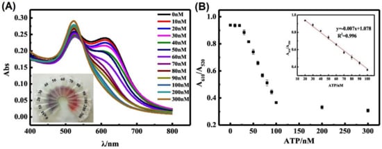 (A) UV–vis absorption spectra of the colorimetric assay with various concentrations of ATP (inset: the corresponding photographs of the solutions); (B) plot of the absorbance ratio (A610/A520) vs. ATP concentration in the range of 0 to 300 nM. The inset illustrates the linear calibration plot of A610/A520 vs. the ATP concentration (20 to 100 nM). Error bars were obtained from three experiments ((A,B) are reproduced with the permission from [86]).