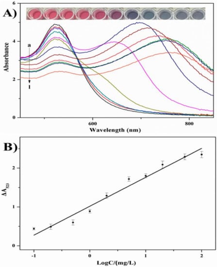 (A) UV–vis spectra and a photograph of (a) AuNP solutions and AuNP solutions with concentrations of chlorsulfuron of (b) 100 mg/L, (c) 50 mg/L, (d) 20 mg/L, (e) 10 mg/L, (f) 5.0 mg/L, (g) 2.0 mg/L, (h) 1.0 mg/L, (i) 0.5 mg/L, (j) 0.2 mg/L, (k) 0.1 mg/L, and (l) 0 mg/L in the presence of 20 mg/L acetamiprid and (B) standard calibration curve of the absorbance change of Au NPs at 523 nm (ΔA523) against chlorsulfuron concentration ((A,B) are reproduced with the permission from [98]).