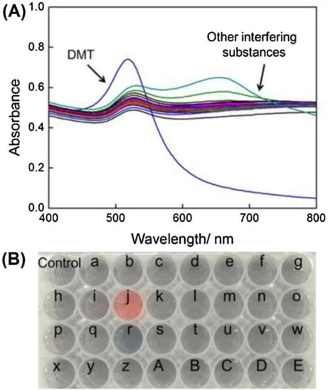 Selectivity of the AuNP-based colorimetric sensor for rapid detection of DMT compared with other substances. UV–vis absorption spectra (A) and photographic images (B) of the AuNP-based colorimetric sensor (0.86 mL) incubated (10 min) with 40 µL of NaOH (1.0 M) plus 100 µL of DMT (0.2 µM), or plus 100 µL of other substances (1.0 µM), or plus 100 µL of H2O (control). (a) Iprodione; (b) Dioxacarb; (c) Benzex; (d) Isoprocarb; (e) Chipton; (f) Pretilachlor; (g) Sodium cyclamate; (h): Permethrin; (i) Trichlorphon; (j) Dimethoate; (k) Fenvalerate; (l) Chlorpyrifos; (m) Profenofos; (n) Indoxacarb; (o) Dichlorodiphenyltrichloroethane; (p) Glufosinate-ammonium; (q) Glyphosate; (r) Terbuthylazine; (s) Deltamethrin; (t) D-glucose; (u) Aspartame; (v) K+; (w) Na+; (x) Mg2+; (y) Ba2+; (z) Cl−; (A) NO3−; (B) Ac−; (C) CO32−; (D) SO42−; (E) PO43− (reproduced with the permission from [101]).