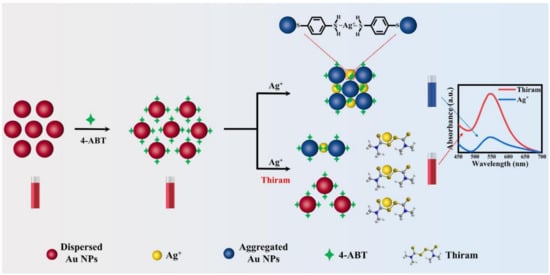- Liu, K.; Jin, Y.; Wu, Y.; Liang, J. Simple and Rapid Colorimetric Visualization of Tetramethylthiuram Disulfide (Thiram) Sensing Based on Anti-aggregation of Gold Nanoparticles. Food Chem. 2022, 384, 132223. [Google Scholar] [CrossRef] [PubMed]