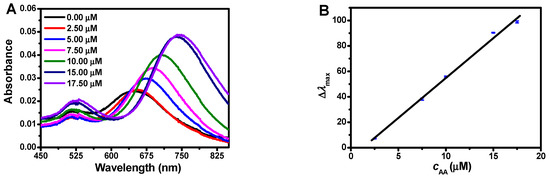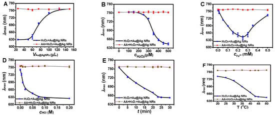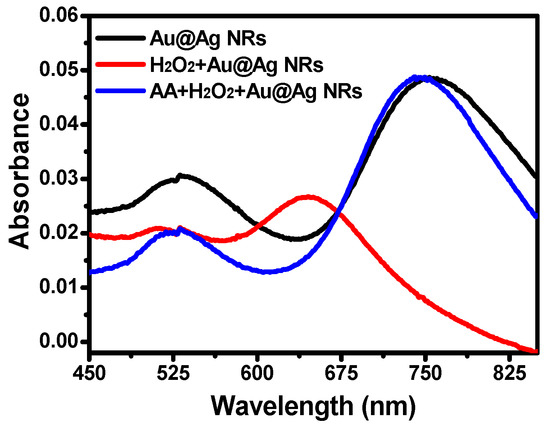 In this etching system, the higher concentration of silver-coated gold nanorods could lead to there being more nanoparticles in solution. In this case, it would be more difficult for them to be completely etched by ·OH. As shown in Figure 5A, when the volume of the silver-coated gold nanorod solution was decreased sequentially from 150 μL to 25 μL, the maximum absorption wavelength was gradually shifted to a shorter wavelength, suggesting the chemical etching of silver-coated gold nanorods. However, when the volume was decreased to less than 25 μL, the absorption spectrum was too weak to detect. To balance this issue, 50 μL of silver-coated gold nanorod solution was chosen to obtain an obvious absorption and a relatively complete etching. Furthermore, the introduction of AA could enable the full restoration of λmax.