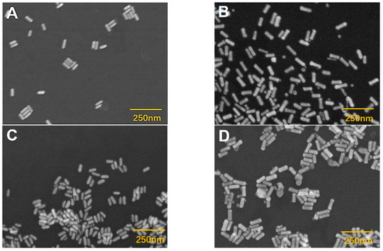 In addition, scanning electron microscopic images were used to confirm the etching of silver-coated gold nanorods (Figure 2 and Figure 3). The original gold nanorods were about 61 nm (Figure 2A and Figure 3A). However, the size of silver-coated gold nanorods was increased to about 90 nm in length, which were presented with a small number of silver nanoparticles (Figure 2B and Figure 3B). When etched with hydroxyl radicals (·OH) from the Fenton reaction between H2O2 and Fe2+, the size of the silver-coated gold nanorods was significantly decreased to about 49 nm (Figure 2C and Figure 3C), suggesting the effective etching of silver-coated gold nanorods by ·OH, which led to a remarkable blue shift of λmax. However, when the etching was suppressed by AA, the particle size of the silver-coated gold nanorods was restored (Figure 2D and Figure 3D), resulting in an obvious red-shift of λmax.