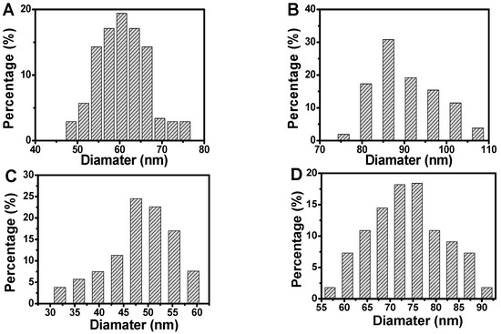 Longitudinal size distribution change during the synthesis and etching of silver-coated gold nanorods. (A) Gold nanorods; (B) silver-coated gold nanorods; (C) etched silver-coated gold nanorods; and (D) the inhibited etching of silver-coated gold nanorods by AA. Conditions: Au@Ag NRs, 50 μL; H2O2, 450 μM; Fe2+; 0.25 mM; HCl, 0.10 M; t, 25 min; T, 45 °C; and AA, 17.5 μM.