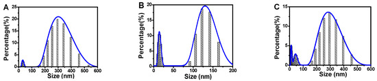 To further confirm the size change of silver-coated gold nanorods in the sensing process, the dynamic light scattering (DLS) particle size distribution was checked (Figure 4).The silver-coated gold nanorods were about 300 nm in length (Figure 4A), while the etched silver-coated gold nanorods were only about 125 nm (Figure 4B). For the same reasoning with SEM, the size of nanoparticles reverted to a similar size (about 300 nm) to the original silver-coated gold nanorods (Figure 4C), which proved the etching process. Herein, the DLS sizes were greater than the sizes obtained from SEM image because the size obtained from DLS was the hydrated particle size including molecules around particles.