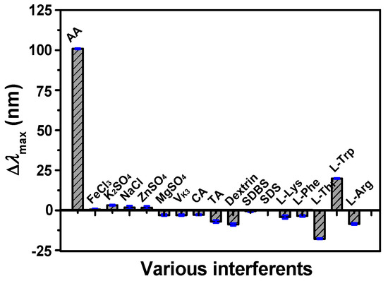 The specificity is an important issue to evaluate the proposed method, which was tested under optimal conditions. Some reactive species such as biomolecules and electrolytes were taken into consideration to examine the specificity of the proposed method of AA detection. The Δλmax responses of different interfering species to silver-coated gold nanorods were assessed, including L-Arg, L-Lys, L-Trp, L-Phe, L-Thr, NaCl, MgSO4, ZnSO4, K2SO4, and so on (Figure 7). Compared with other interfering species, the response of AA was more remarkable even though the concentrations of other interfering species were five times higher than AA, suggesting that silver-coated gold nanorods were highly selective toward AA due to the strong reluctivity of AA to eliminate the OH radical.