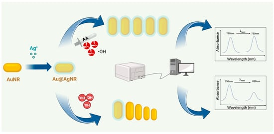 In this work, gold nanorods acted as the initial optical probe, which was then coated by a silver layer of to obtain the silver-coated gold nanorod probe. Previous studies have shown that hydroxyl radicals produced by the Fenton reaction have a strong effect on the etching of gold nanorods [23]. The main etching mechanism is that hydroxyl radicals possess strong oxidation ability, which can oxidize and etch the atoms on the surface of the nanorod. In addition, the silver layer on the gold core is more easily oxidized than gold atoms, so silver-coated gold nanorods could present a more sensitive maximum absorption peak shift [18,20,23]. Thus, silver-coated gold nanorods were etched with the hydroxyl radicals generated by the Fenton reaction between H2O2 and Fe2+ under acidic conditions, resulting in a lower aspect ratio of silver-coated gold nanorods, which was accompanied by the blue shift of the longitudinal localized surface plasmon resonance (λmax). However, when AA was introduced to the etching system, the generation of the hydroxyl radical and the etching reaction were inhibited, leading to less of a blue shift of λmax (Scheme 1).