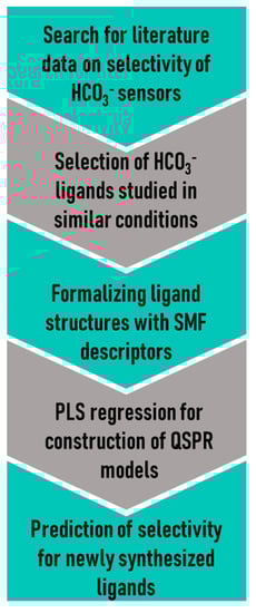 The present work is devoted to study whether it will be possible to predict potentiometric selectivity of the sensors based on newly synthesized ligands using a QSPR model based on literature data. As a challenging case for modeling, we have focused on carbonate-selective sensors, where the number of available ligands with appropriate selectivity is rather limited. The selectivity values logKsel(HCO3−/Cl−) were used as a target parameter for modeling.