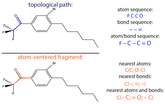 “MolFrag”, which is a part of “ISIDA QSPR” software suite was used to obtain SMF [19]. SMF in ISIDA can be described in two ways: either as sequences of atoms and/or bonds (topological path) or as a selected (“augmented”) atom (atom-centred fragments) with its environment, which can be atoms, bonds, or both of them. Both ways are illustrated in Figure 2.