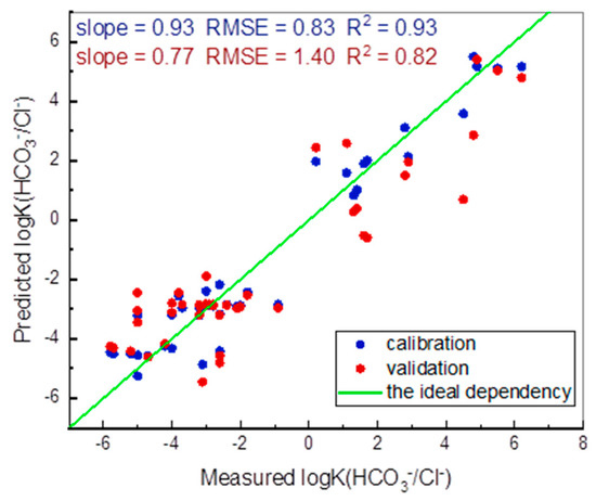 “Measured vs predicted” plot of cross-validated QSPR model for predicting the selectivity of membrane sensors. The green line corresponds to the ideal match between measured and predicted values.