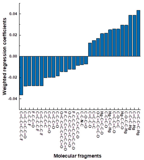 The analysis of the regression coefficients of the PLS model allows judging on the importance of particular descriptors and their contribution to the selectivity values. The largest contribution is made by the fragments having the highest absolute values of regression coefficients. Calculated fragments (model variables) were filtered by the presence of at least five ligand structures. Then, the remaining fragments were analysed for repeatability in other fragments, and the smallest fragments were chosen from the row of equivalent fragments. In this way, the fragment C-C-C-O-C=C contains the shorter fragment C-O-C=C, and this shorter fragment was kept for analysis. Finally, the fragments were sorted by the value of the corresponding regression coefficients and only the fragments with absolute values of b < 0.01 were considered. The resulting variable importance graph is shown in Figure 4.