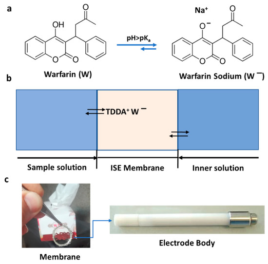 (a) Molecular structure of warfarin and warfarin sodium; at pH > pKa, the predominant species that can be detected by the developed ion-selective electrode (ISE) is warfarin sodium. (b) Schematic presentation of the warfarin-selective PVC-based membrane; the inner solution contains 1 mM warfarin and 1 mM NaCl in 0.05 M phosphate buffer (pH = 7.4). (c) Picture of the developed membrane (8 mm) and the corresponding electrode body.