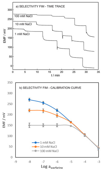 Reversibility, reproducibility, and long-term stability of the ISE were the other parameters that needed to be investigated. The reversibility of the warfarin sensor was investigated by applying solutions containing 10−4 and 10−3 M warfarin. As shown in Figure 5b, the warfarin sensor possesses reasonable reversibility with a relative standard deviation (%RSD) below 1%. To measure the long-term stability, the ion-selective electrode was placed in the solution containing 10−3 M warfarin for 24 h and a drift of 0.2 mV/h was obtained, which is acceptable.