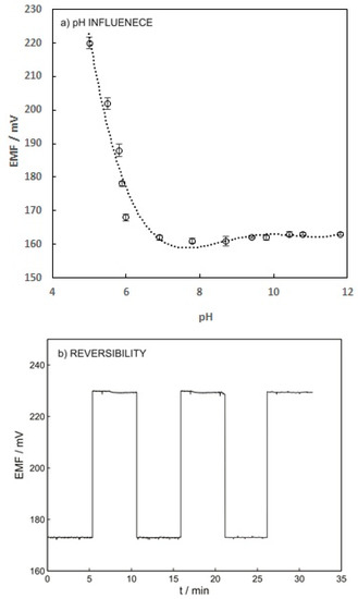 Figure 5a indicates that increasing the pH from 5 to 7 results in increasing the potentiometric response of the ISE. This effect can be explained by the pKa value of warfarin (5.5) and its speciation. The warfarin speciation diminished by increasing the pH from pKa to a higher value, which led to an increase in the free ion concentration. The sensor response reached a plateau within the pH range of 7 to 12 since all the warfarin exists in free ion form at pH above 7 [31].