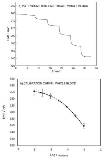 (a) Potentiometric time trace for ISE-M3 in a blood sample with an inner solution as for Figure 3. (b) Calibration curve as a function of logarithmic warfarin activity.