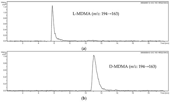 - Rasmussen, L.B.; Olsen, K.H.; Johansen, S.S. Chiral separation and quantification of R/S-amphetamine, R/S-methamphetamine, R/S-MDA, R/S-MDMA, and R/S-MDEA in whole blood by GC-EI-MS. J. Chromatogr. B 2006, 842, 136–141. [Google Scholar] [CrossRef] [PubMed]