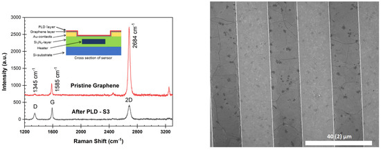 Left—Raman spectra of CVD graphene in sensor device, recorded before (pristine) and after PLD process (a.u. means arbitrary intensity units of the Raman instrument; the spectrum of pristine graphene is shifted upwards by 650 units). Inset: Scheme of the sensor based on PLD-functionalized CVD graphene on the micro-hotplate sensor substrate. Right—SEM image of single-layer graphene on top of interdigitated electrodes of the sensor substrate.