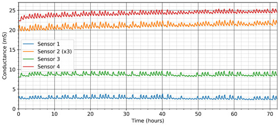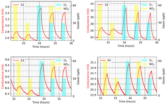 Figure 4 shows an overview of time-dependent conductivities for the four sensors on a micro-hotplate substrate during an experimental run. The gas exposure period (ON) lasted for 15 min. and the recovery period (OFF) for 30 min. Considering the goal of semiquantitative gas analysis, two concentrations of pure NO2 and O3 (30 and 60 ppb) and their mixture (30 ppb of NO2 + 30 ppb of O3) were chosen for gas sensing and machine learning studies. Thus, the sensors were randomly exposed to five different gaseous environments. Overall, the sensor array was subjected to nearly 100 such gas concentration cycles over a period of 72 h. Under real sensing conditions, the gas composition generally changes more gradually. However, such an ON-OFF gas exchange protocol can be implemented in real sensors by flow modulation (sniffing [42,43] or by releasing the gases from a pre-concentrator).