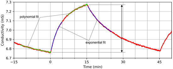Figure 6 shows an enlarged view of a typical transient response when exposed to ppb-levels of gas. Several characteristic features derived from such transient response can potentially be utilized for the subsequent machine learning [47]. In the case of two gas components, either a pair of reasonably different sensors or two complementary features of a single sensor are needed at least. Hereby, we considered three types of features having the most straightforward physical interpretation: the response amplitude (difference between the maximum and minimum values of the recorded signal over one cycle), the response rate (inverse rise time) and the recovery rate (inverse recovery time). The first two quantities are directly related to the concentration of the respective gases, whereas the recovery rate is determined by the adsorption energy of gas molecules [8,9]. Curve fitting was exclusively used to derive the feature values (Figure 6). The rate constants were obtained by fitting the initial rising and decaying parts of the transient response curve with the function ae−kt + b (where the parameter k represents either the response rate or the recovery rate), because effectively a first-order kinetics can be assumed over a limited time span. To reduce the effect of noise and other minor irregularities, the terminal value of the conductivity (at the end of the response or recovery period) was determined from the endpoint of a second order polynomial fitted through a preceding section of the curve.