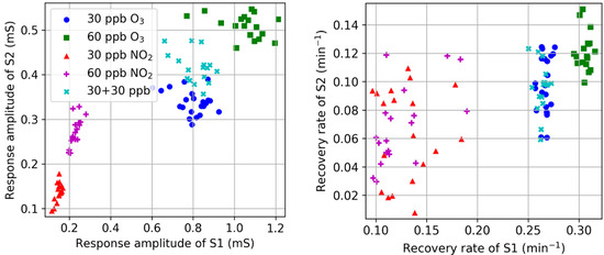 Figure 7 shows a couple of examples of how the data points cluster in 2D feature space. In terms of the response amplitudes of complementary sensors (such as S1 and S2), the data points remain sufficiently well localized and segregated so that there is only minor overlapping of the domains corresponding to different gas environments. However, the recovery rates do not show such clustering. The regions of 30 ppb NO2 and 60 ppb NO2 are completely overlapping, whereas O3-related data points are significantly shifted along one coordinate.