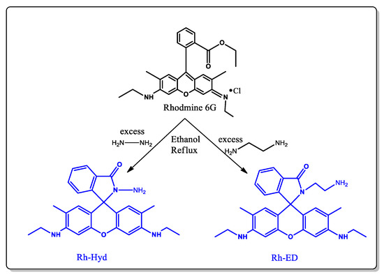 | Rhodamine B with N,N-bis- (2-hydroxyethyl)ethylenediamine (R1) and tert-butyl carbazate group (R2) units | 5.7 × 10−7 M (R1) and 4.6 × 10−7 M (R2) | [18] |