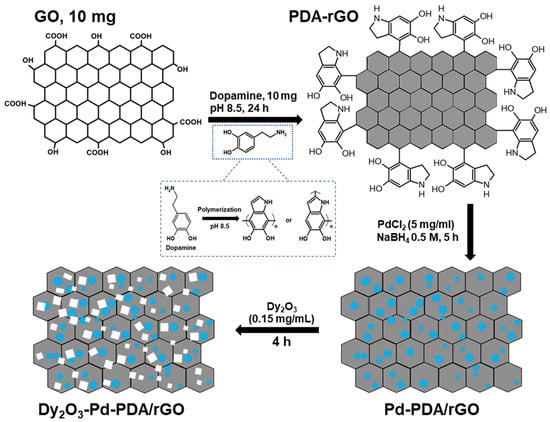 Schematic diagram of the synthesis process of the Dy2O3-Pd-PDA/rGO nanocomposite.