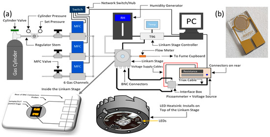 (a) Schematic diagram of the gas sensing system. Adapted with permission [8]. (b) A photo of the IDTs used for the fabricated sensors.