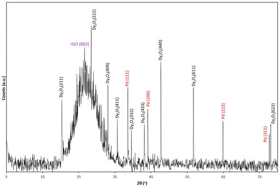 It is also seen a sharp peak at 28.5°, which corresponds to Dy2O3 (222) plane. Diffraction peaks at 2θ = 20.3°, 28.5°, 33°, 35.7°, 39.6°, 43.1°, 47.7°, 56.7°, and 78° assigned to the (211), (222), (400), (411), (332), (433), (440), (611), and (622) crystalline planes, respectively clearly indicate the cubic phase of the Dy2O3, and the peaks fit very well with the JCPDS data card No. 78-0388 [31]. The other sharp peaks that appear at 2θ = 38.6°, 44.1°, 64.7°, and 77.75° attributed to the (111), (200), (222), and (311) planes, respectively, confirm the face-centred cubic (FCC) structure of the Pd NPs inside the rGO NSs with an average of 13 nm crystalline size, which is calculated by Scherrer (Equation (3)) and fits well to the JCPDS DATA CARD No.5-681 [22].