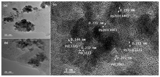 (a–c) HRTEM images of Dy2O3-Pd-PDA/rGO nanocomposite in different magnifications. (c) shows interplanar spacings of Pd NPs and Dy2O3.
