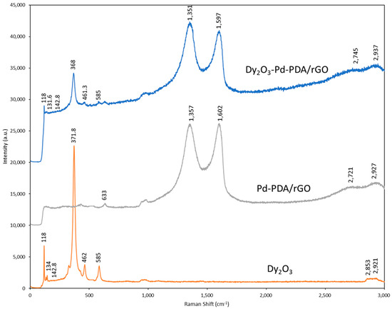 Raman analysis of Dy2O3-Pd-PDA/rGO nanocomposite, Pd-PDA/rGO, and Dy2O3.