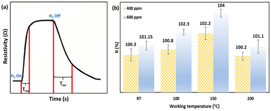 Optimising the operating temperature is one of the critical factors in gas sensing, which directly relates to the experiment’s power consumption and cost. The fabricated Dy2O3-Pd-PDA/rGO based conductometric sensor was examined towards 400 ppm and 600 ppm H2 at different working temperatures under UV (365nm) illumination and 0% relative humidity (%RH). The operating temperature was changed from RT (30 °C) to 200 °C, and a change in resistivity of the sensor was monitored throughout the experiment. It was observed that the sensor’s response (resistivity) increased by increasing the operating temperature from RT (30 °C) up to 150 °C, due to the acceleration of the adsorption/desorption kinetics between the H2 molecules and the Dy2O3-Pd-PDA/rGO composite sensing layer [39,40]. Further increasing the operating temperature to 200 °C led to a decrease in the sensing response. This result can be attributed to the increase of the desorption rate of H2 molecules compared to the adsorption rate while raising the temperature further than the optimum temperature, which is called the Langmuir effect [40]. Therefore, the optimum working temperature was found to be 150 °C. The 150 °C temperature corresponds to the 86 meV potential, which is among typical overpotential values in electrochemical hydrogen evolution reaction (HER) of water splitting [41]. Figure 8a shows the typical p-type semiconducting sensing behaviour of the sensor as the conductivity decreases towards H2 (reducing gas). The increase in the resistivity of the p-type sensor upon exposure to the reducing gas is due to the charge transfer from the target gas molecules to the sensing layer [1,41]. As an electron donor gas, H2 transfers electrons to the valent band of the sensing layer, reducing the hole concentration on the surface, resulting in an increase in resistivity. Figure 8b illustrates the response of the sensor towards 400 and 600 ppm H2 at different temperatures.