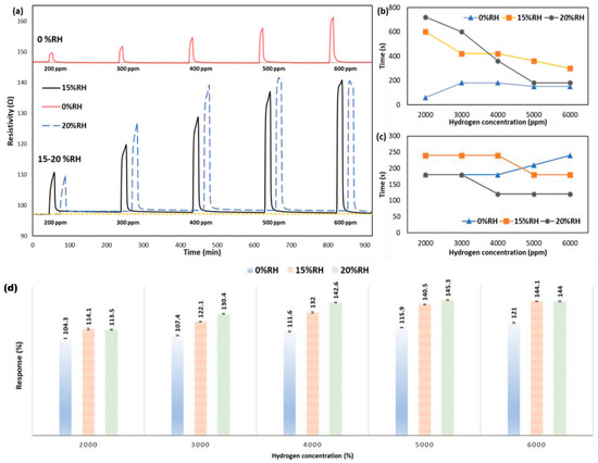 Figure 10 also compares the response and recovery times while increasing the humidity level and H2 concentrations. A fast response and recovery, 60 s and 180 s, respectively, were measured for 2000 ppm H2 at 150 °C and 0 %RH. It can be seen that both response and recovery times decrease by rising the H2 concentration at a higher humidity level than 0 %RH due to an increase in the surface coverage rate accelerating the adsorption/desorption of the H2 molecules [65]. In addition, the high permeability of the Dy2O3-Pd-PDA/rGO to water molecules and the hoping proton mechanism play essential roles in the sensing performance [49,66]. When the concentration of the adsorbed water molecules increases on the surface (by increasing the %RH from 15% to 20%), the arisen protons (H+), from hydroxyl functional groups of the rGO, bond with the water molecules. This leads to forming the hydronium ions, which enhance the electric charge density [39,63]. Thus, by increasing the concentration of the H2 molecules, the adsorption/desorption interactions become quicker due to the increased gas diffusion and conductive routes with high mobility [67,68]. Consequently, by comparing the response and recovery times at 15% and 20 %RH, we observe quicker response and recovery by increasing the H2 concentration at 20 %RH. Moreover, by raising the humidity to 20%, the sensor’s recovery became faster than it was at 0 % RH due to the physical and chemical adsorption/desorption rate of the H2 molecules.