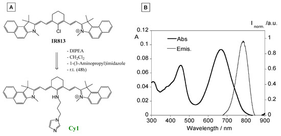 The synthesis of Cy1 was designed by following the indications reported by Bouteiller and co-workers [38]. Cy1 was obtained by post-synthetic derivatization of the commercially available dye IR-813 p-toluenesulfonate through a SRN1 reaction of its meso-chlorine atom with 1-(3-Aminopropyl)imidazole and DIPEA in dichloromethane at room temperature. Cy1 was obtained as a dark green powder with a yield of 56%, and characterized by 1NMR, FTIR, Mass spectrometry (ESI-QqTOF), UV-vis and fluorescence emission spectroscopy, showing analytical data in accordance with its structure.