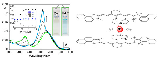 The sensorial ability of Cy1 towards Zn2+, Cd2+, Cu2+, Co2+, Ni2+ and Hg2+ metal ions was evaluated in acetonitrile. Similar spectral and colourimetric changes were observed for all metal ions except for Cu2+ metal ions (see Figure 2). As an example, Figure 2A shows the spectral behaviour of Cy1 upon the addition of Zn2+ metal ions. Figure S3 shows the absorption spectra of the titrations with the other metal ions. The increasing addition of this metal leads to a blue shift in the absorption band from 668 nm to 633 nm, with a consequent change in colour from pale green to blue. Regarding emission spectra, no changes were observed upon the addition of Zn2+, Cd2+, Co2+, Ni2+ and Hg2+ metal ions.