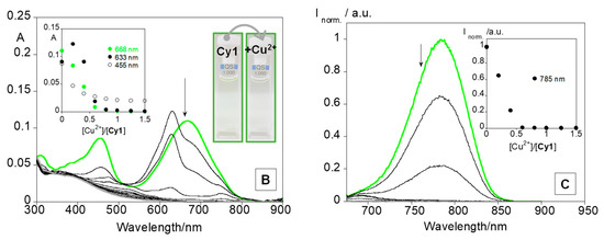 On the other hand, the subsequent addition of Cu2+ ions to the Cy1 solution results in a shift of the absorption band from 668 nm to 633 nm followed by a gradual decrease in the absorption at 633 nm. Moreover, colourimetric changes from pale green to blue and consequently to colourless were visualized. Furthermore, quenching on the emission intensity at 785 nm is also verified with Cu2+, due to its paramagnetic nature leading to non-radiative deactivation processes [39,40].