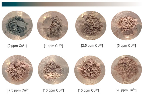 Whether no visible alterations were verified for Hg2+, a clear change was registered in the presence of Cu2+. Figure 4 shows the colourimetric profile obtained for each copper concentration. Nanomaterials maintained their greyish dark blue colouration when exposed to water without the presence of metals. Moreover, the respective aqueous supernatant did not present any colouration, indicating that the majority of the derivatives remained encapsulated, with no apparent signs of release to the medium. However, when exposed to copper concentrations, even as low as 1 ppm, slight colourimetric alterations were verified. After exposure to copper ions, the nanomaterial acquired a light brown tonality that became increasingly lighter up to 5 ppm of Cu2+ and maintained that same colouration at higher copper concentrations.