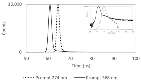 Our equipment uses two different Horiba Jobin Yvon NanoLED excitation sources that operates at either 274 nm or 368 nm (N-270 and N-370 LED heads, respectively) for time-correlated single photon counting experiments. This constitutes the main limitation of this study since these two diodes display typical pulse widths less than 1.2 ns, so close to the best decay times we are currently measuring and expecting (and even longer than commercial references BC-422Q 1% and 2%) []. One can see that the excitation profile is not purely monoexponential, with a bump appearing a few nanoseconds after the pulse. Their full-width at half maximum (FWHM) values are 1.48 ns ± 0.11 ns and 1.68 ns ± 0.11 ns. Without any access to better-resolved pulse diodes, the results are presented as such.
